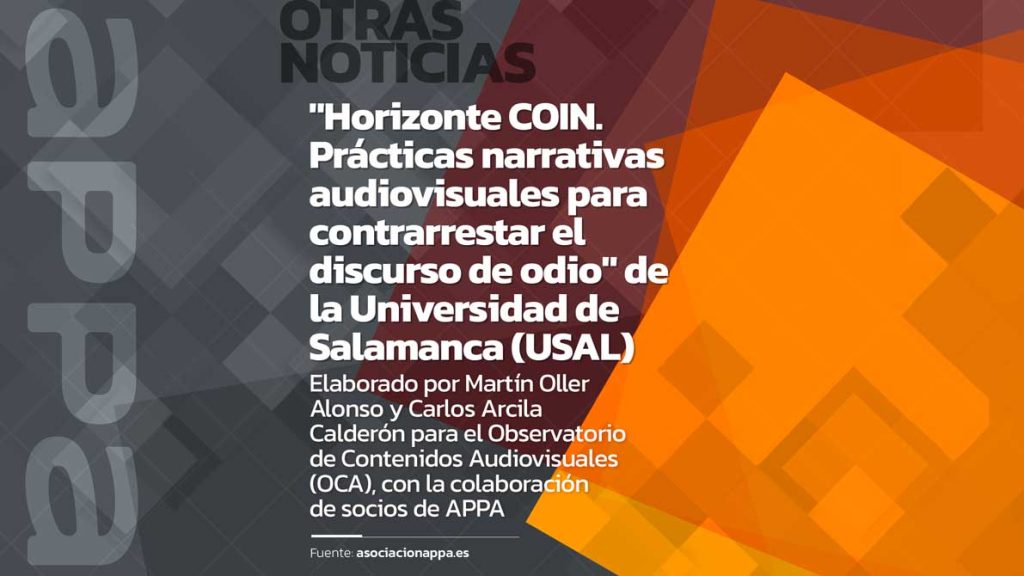 El Observatorio de Contenidos Audiovisuales (OCA) de la Universidad de Salamanca (USAL) ha publicado el informe “Horizonte COIN. Prácticas narrativas audiovisuales para contrarrestar el discurso de odio”, elaborado por Martín Oller Alonso y Carlos Arcila Calderón, que ha contado con la colaboración de socios de APPA. Con el objetivo de identificar principios, herramientas y métricas […]